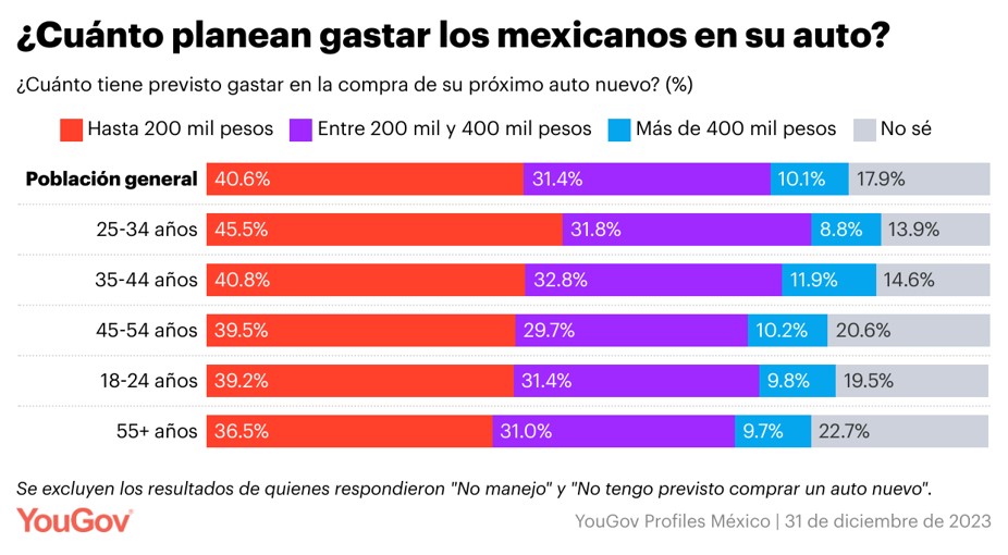 Así, los modelos usados o seminuevos pueden ser una opción para quienes quieren un cambio, pero sin que eso signifique endeudarse de más o dejar vacío el cochinito, puesto que la mayoría de los mexicanos tienen intenciones de gastar relativamente poco en su próximo vehículo. Cuatro de cada 10 consumidores que piensan comprar un auto pronto, quieren gastar menos de 200,000 pesos, mientras que el 10.1% de la población tiene planeado gastar más de 400 mil pesos en hacerse de un cochecito nuevo.