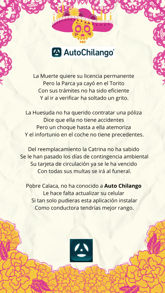 Este Día de Muertos de 2024 queremos dedicar unos versos a nuestros usuarios y al equipo de Auto Chilango, que hace posible que toda la información para circular sobre Chilangolandia con seguridad y al tanto de todas las novedades.